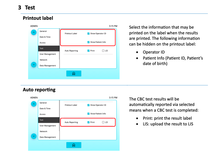 Select both boxes in 'printout label' and select LIS for 'auto reporting'