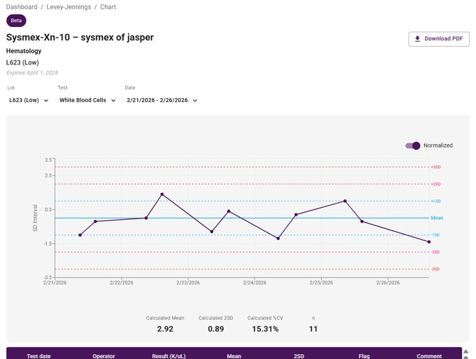 Levey-Jennings is currently in beta — we'd love to hear how it's working for you. Share your feedback via the in-app chat box, raise a support ticket, or contact us directly.