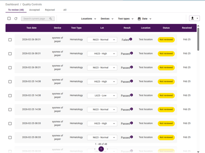 Go to Compliance > Quality Controls. Results are grouped into tabs: To Review, Accepted, Rejected, and All.