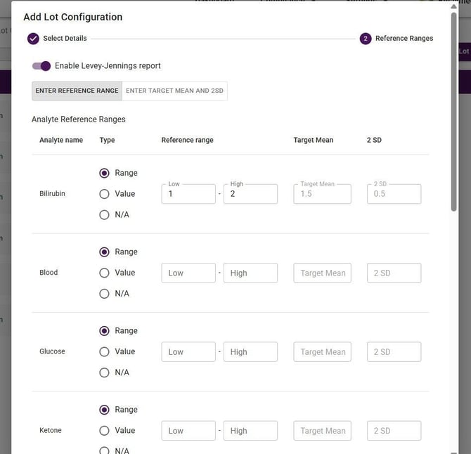 Note: Levey-Jennings charts are only available for analytes with a numeric reference range (Range type). If you've enabled Levey-Jennings, make sure at least one analyte is set to Range before saving.