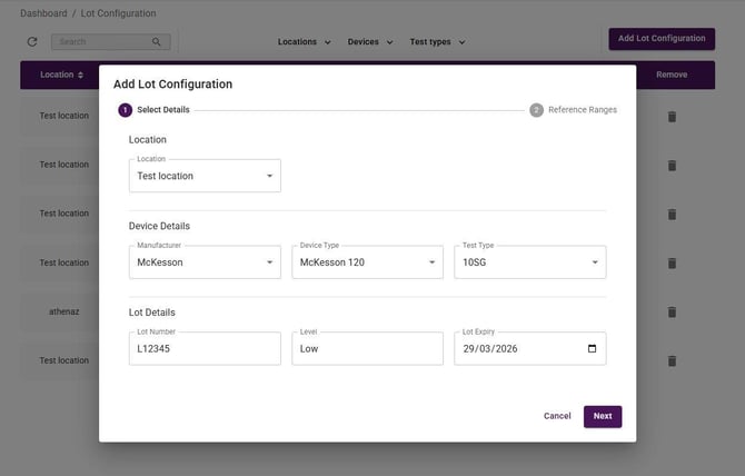 Select the location, manufacturer, device type, and test type. Then enter the lot number and level as printed on the box, and the expiry date.