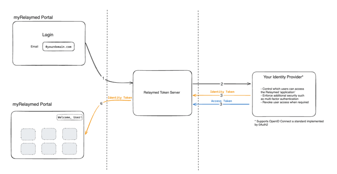 When a user with SSO logs into the myRelaymed portal our authentication system sends a request to the identity prover associated with the user. The user logs into the system as they would do normally with other applications, which may include Multi-Factor Authentication prompts or other security protocols. Once successfully authenticated, two tokens are returned to our system: